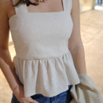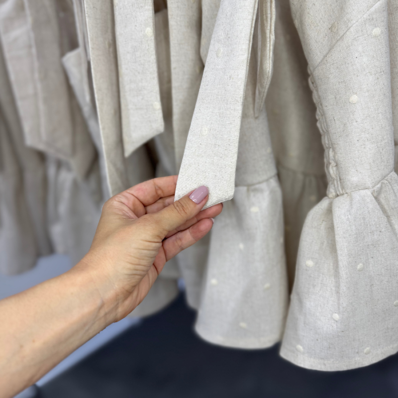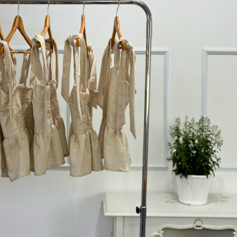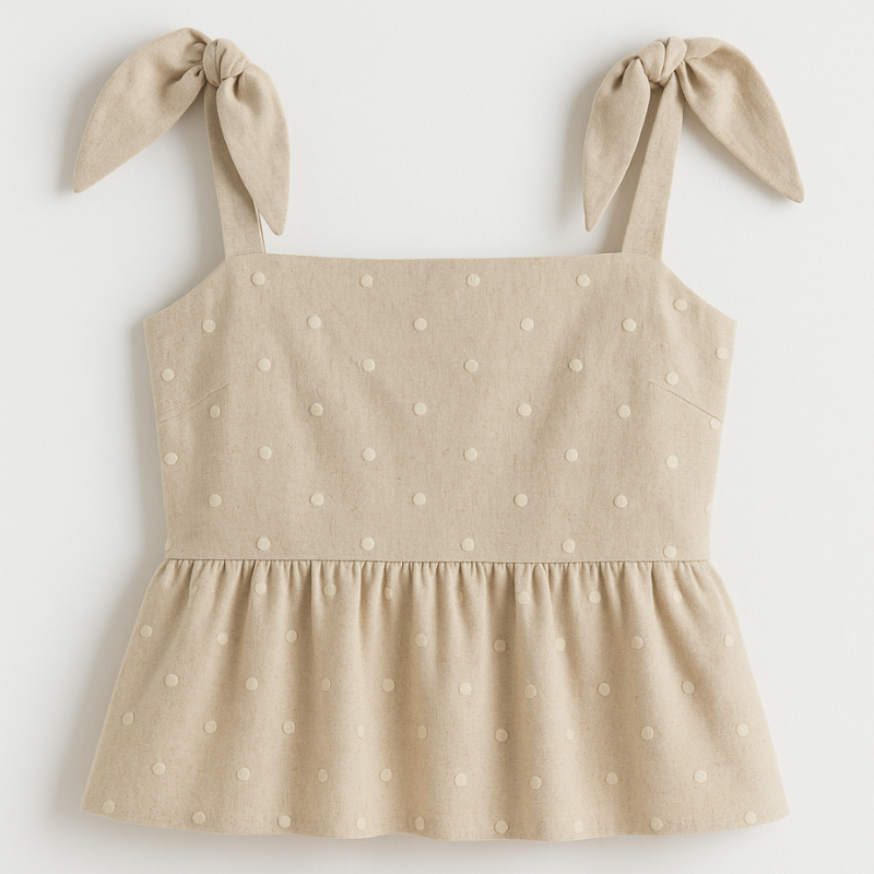 Delicado e atemporal, este top em linho traz leveza e charme para os dias quentes. Possui tecido em linho com textura suave e poás bordados que dão um toque artesanal e exclusivo. As alças largas com amarração nos ombros permitem regular o caimento conforme desejar, e o babado na barra cria um movimento romântico e feminino.